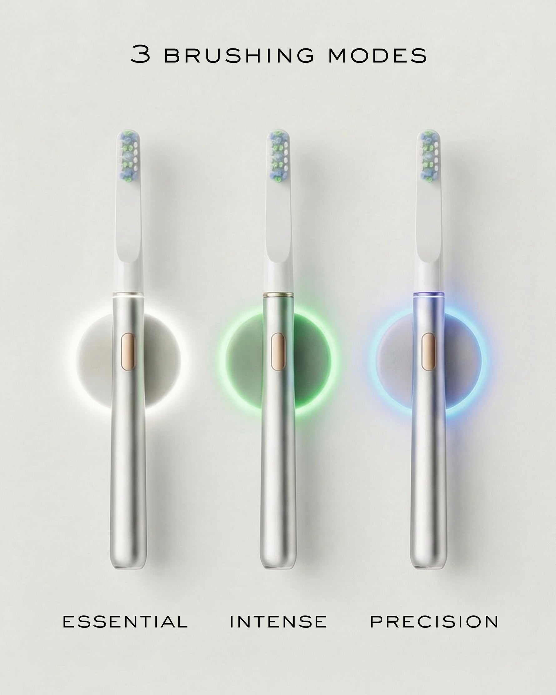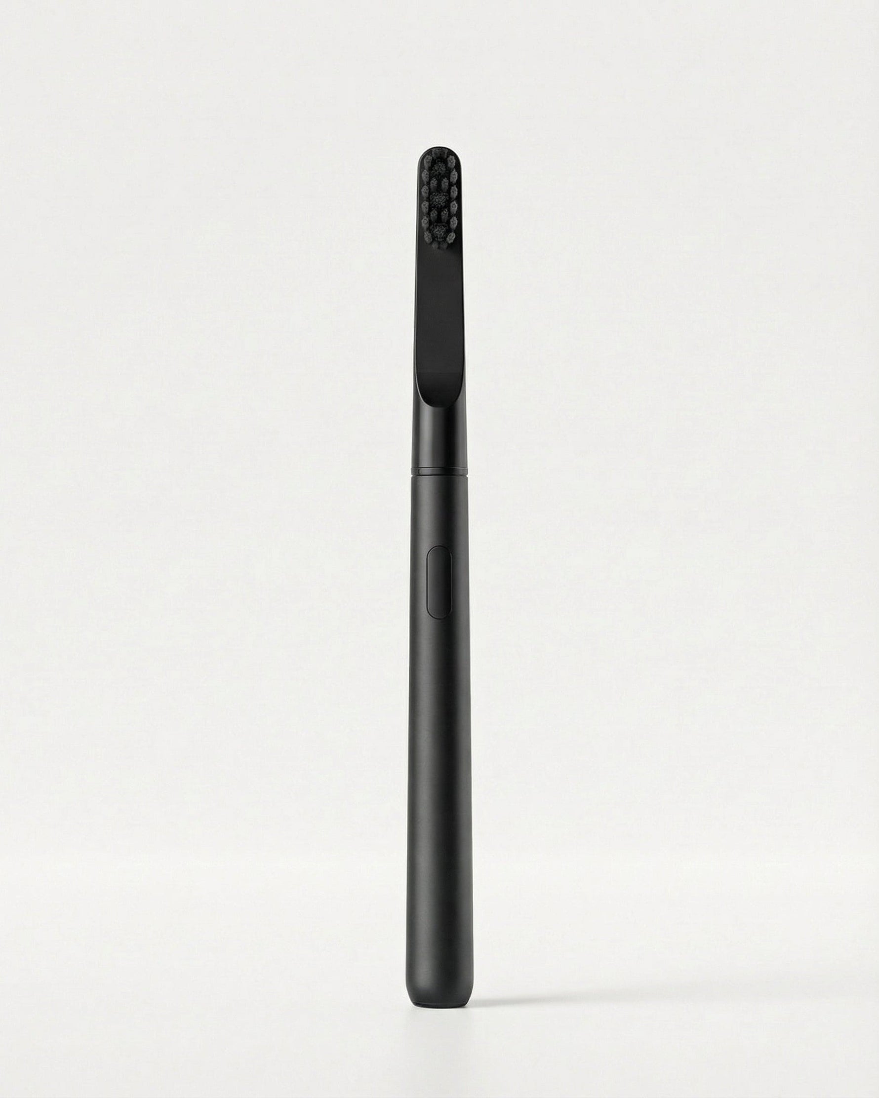 A standard rotary toothbrush oscillates between 3,000 and 8,000 movements per minute. The ORAAK brush generates 32,000 vibrations per minute, a sonic frequency that creates a dynamic, fluid cleaning action that goes beyond simple bristle contact, reaching even beneath the gums and between the teeth.